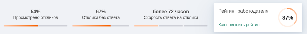 Рейтинг работодателя - это сводный показатель, который помогает отследить, насколько хорошо компания обрабатывает полученные отклики. Рейтинг включает: