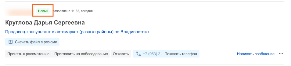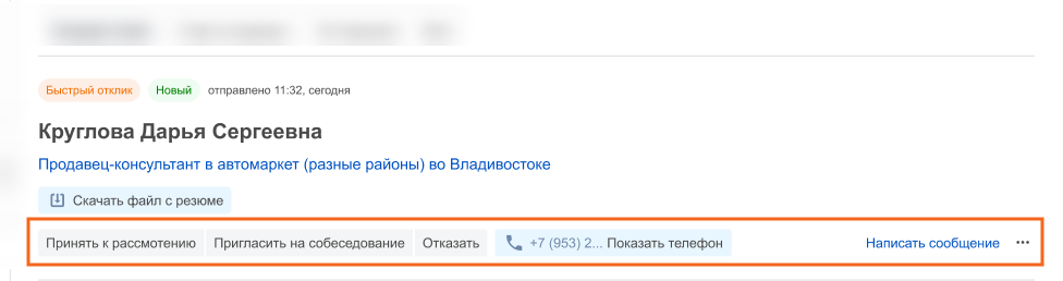 Если вы связались с соискателем по номеру телефона, то не забудьте отметить такой отклик как "принятый к рассмотрению" или отправить "приглашение на собеседование".