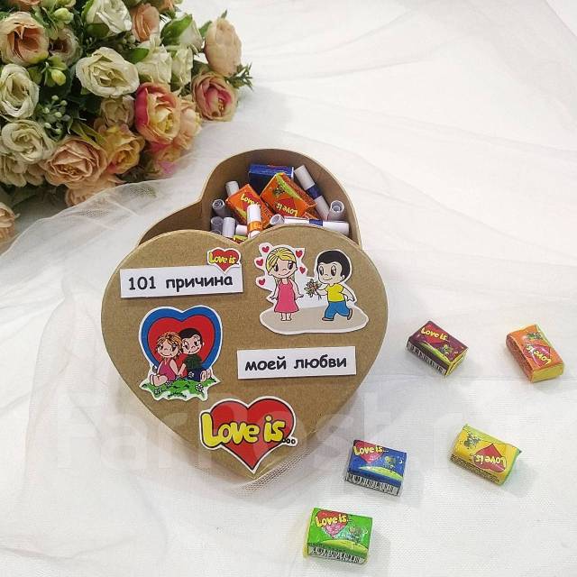 "101 причина + Love is..." - очень романтичный подарок. Коробочка в виде вмещает 101 записочку с милыми признаниями в любви и 10 жевательных резинок с вкладышами про любовь.